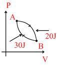 In a cyclic process shown in the figure an ideal gas is adiabatically taken from B and A, the work done on the gas during the process B → A is 30 J, when the gas is taken from A → B the heat