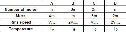 Four containers are filled with mono atomic ideal gases. For each container, the number of moles, the mass of an individual atom and the rms speed of the atoms are expressed in terms of n, m and vrms respectively. If TA, TB, TC and TD are their temperatures respectively then which one of the options correctly represents the order ?