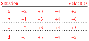 A one dimensional gas is a hypothetical gas with molecules that can move along only a single axis. The following table gives four situations, the velocities in meter per second of such a gas having four molecules. The plus and minus sign refer to the direction of the velocity along the axis.