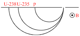 Protons and singly ionized atoms of U235 & U238 are passed in turn (which means one after the other and not at the same time) through a velocity selector and then enter a uniform magnetic field. The protons describe semicircles of radius 10 mm. The separation between the ions of U235 and U238 after describing semicircle is given by