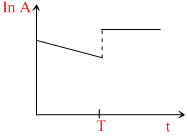 At time t = 0, some radioactive gas is injected into a sealed vessel. At time T, some more of the same gas is injected into the same vessel. Which one of the following graphs best represents the variation of the logarithm of the activity A of the gas with time t ?