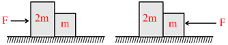 Two blocks are in contact on a frictionless table. One has mass m and the other 2m. A force F is applied on 2m as shown in the figure. Now the same force F is applied from the right on m. In the two cases respectively, the ratio of force of contact between the two blocks will be :