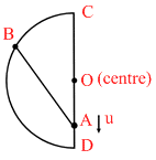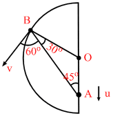 Two beads A and B move along a semicircular wire frame as shown in figure. The beads are connected by an inelastic string which always remains tight. At an instant the speed of A is u, ⎳BAC = 45o and ⎳BOC = 75o where O is the centre of the semicircular arc. The speed of bead B at that instant is :