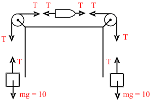 T − mg = 0 [Equilibrium of block]