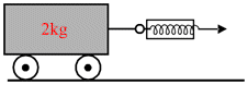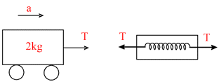 A massless spring balance is attached to 2 kg trolley and is used to pull the trolley along a flat surface as shown in the fig. The reading on the spring balance remains at 10 kg during the motion. The acceleration of the trolley is (Use g = 9.8 ms-2)