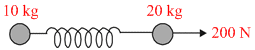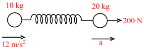 Two masses of 10 kg and 20 kg respectively are connected by a massless spring as shown in figure. A force of 200 N acts on the 20 kg mass at the instant when the 10 kg mass has an acceleration of 12 ms-2 towards right, the acceleration of the 20 kg mass is :