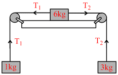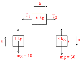 Three masses of 1 kg , 6 kg and 3 kg are connected to each other with threads and are placed on table as shown in figure. What is the acceleration with which the system is moving ? Take g = 10m s-2 .