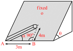 There is an inclined surface of inclination θ = 30o. A smooth groove is cut into it forming angle a with AB. A steel ball is free to slide along the groove. If the ball is released from the point O at top end of the groove, the speed when it comes to A is: [g = 10 m/s2]