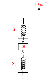 Reading shown in two spring balances S1 and S2 is 90 kg and 30 kg respectively when lift is accelerating upwards with acceleration 10 m/s2. The mass is stationary with respect to lift. Then the mass of the block will be :