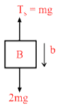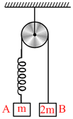 In the figure a block ′A′ of mass ′m′ is attached at one end of a light spring and the other end of the spring is connected to another block ′B′ of mass 2m through a light string. ′A′ is held and B is in static equilibrium. Now A is released. The acceleration of A just after that instant is ′a′. In the next case, B is held and A is in static equilibrium. Now when B is released, its acceleration immediately after the release is ′b′. The value of a/b is :