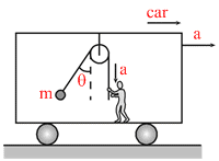 (Force diagram in the frame of the car) Applying Newton′s law perpendicular to string