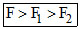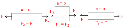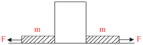 A heavy block kept on a frictionless surface and being pulled by two ropes of equal mass m as shown in figure. At t = 0, the force on the left rope is withdrawn but the force on the right end continues to act. Let F1 and F2 be the magnitudes of the forces by the right rope and the left rope on the block respectively.