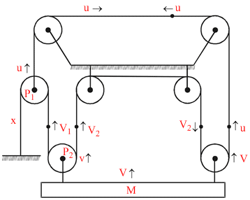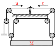 System is shown in the figure and man is pulling the rope from both sides with constant speed ′u′. Then the speed of the block will be (M moves vertical):