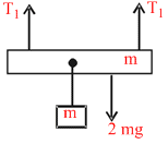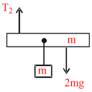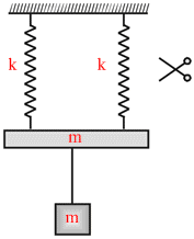 System shown in figure is in equilibrium. The magnitude of change in tension in the spring just before and just after, when one of the spring is cut. Mass of both the blocks is same and equal to m and spring constant of both springs is k. (Neglect any effect of rotation)