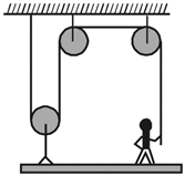 A 50 kg person stands on a 25 kg platform. He pulls mass less rope which is attached to the platform via the frictionless, massless pulleys as shown in the fig. The platform moves upwards at a steady velocity if the force with which the person pulls the rope is