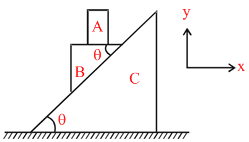 In the figure shown all the surface are smooth. All the blocks A, B and C are movable X-axis is horizontal and y-axis vertical as shown. Just after the system is released from the position as shown.