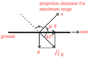 As shown in figure, the net acceleration of projectile makes on angle 45o with horizontal. For maximum range on horizontal plane, the angle of projection should be along angle bisector of horizontal and opposite direction of net acceleration of projectile.