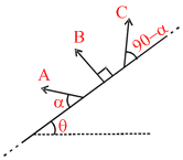 Three stones A, B, C are projected from surface of very long inclined plane with equal speeds and different angles of projection as shown in figure. The incline makes an angle θ with horizontal. If HA, HB and HC are maximum height attained by A, B and C respectively above inclined plane then : (Neglect air friction)