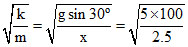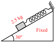 A smooth inclined plane having angle of inclination 30o with horizontal has a mass 2.5 kg held by a spring which is fixed at the upper end as shown in figure. If the mass is taken 2.5 cm up along the surface of the inclined plane, the tension in the spring reduces to zero. If the mass is then released, the angular frequency of oscillation in radian per second is