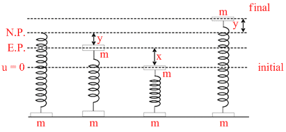 Two plates of same mass are attached rigidly to the two ends of a spring as shown in figure. One of the plates rests on a horizontal surface and the other results a compression y of the spring when it is in equilibrium state. The further minimum compression required, so that when the force causing compression is removed the lower plate is lifted off the surface, will be :