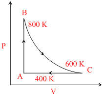 One mole of diatomic ideal gas undergoes a cyclic process ABC as shown in figure. The process BC is adiabatic. The temperatures at A, B and C are 400 K, 800 K and 600 K respectively. Choose the correct statement