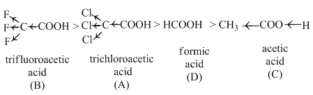 The correct order of decreasing acid strength of trichloroacetic acid (A), trifluoroacetic acid (B), acetic acid (C) and formic acid (D) is