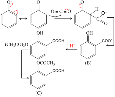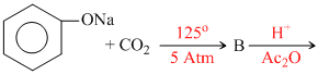 Sodium phenoxide when heated with CO2 under pressure at 125oC yields a product which on acetylation produces C.