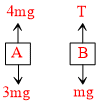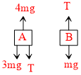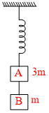 Two blocks A and B of masses 3 m and m respectively are connected by a massless and 1nextensible string. The whole system is suspended by a massless spring as shown in figure. The magnitudes of acceleration of A and B immediately after the string is cut, are respectively :-