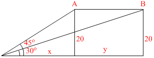 A bird is sitting on the top of a vertical pole 20 m high and its elevation from a point O on the ground is 45o. It flies off horizontally straight away from the point O. After one second, the elevation of the bird from O is reduced to 30o. Then the speed (in m/s) of the bird is