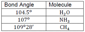 The H O H bond angle in CH4, the H N H bond angle in NH3, and the H O H bond angle in H2O are all greater than 90o .
