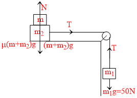 Two masses m1 = 5kg and m2 = 10kg, connected by an inextensible string over a frictionless pulley, are moving as shown in the figure. The coefficient of friction of horizontal surface is 0.15. The minimum weight m that should be put on top of m2 to stop the motion is :-