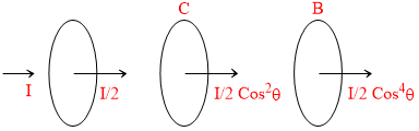 Unpolarized light of intensity passes through an ideal polarizer A. Another identical polarizer B is placed behind A. The intensity of light beyond B is found to be 1/2. Now another identical polarizer C is placed between A and B. The intensity beyond B is now found to be . The angle between polarizer A and C is :