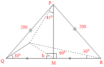 PQR is a triangular park with PQ = PR = 200 m. A T.V. tower stands at the mid-point of QR. If the angles of elevation of the top of the tower at P,Q and R are respectively 45o, 30o and 30o, then the height of the tower (in m) is-