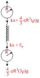 A solid sphere of radius R and density ρ is attached to one end of a mass-less spring of force constant k. The other end of the spring is connected to another solid sphere of radius R and density 3ρ. The complete arrangement is placed in a liquid of density 2ρ and is allowed to reach equilibrium. The correct statement(s) is (are)