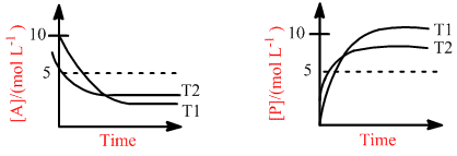 For a reaction, A P, the plots of [A] and [P] with time at temperatures T1 and T2 are given below.