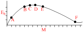 The above is a plot of binding energy per nucleon Eb, against the nuclear mass M; A, B, C, D, E, F correspond to different nuclei. Consider four reactions: