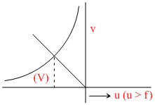 In an optics experiment, with the position of the object fixed, a student varies the position of a convex lens and for each position, the screen is adjusted to get a clear image of the object. A graph between the object distance u and the image distance v, from the lens, is plotted using the same scale for the two axes. A straight line passing through the origin and making an angle of 45o with the x-axis meets the experimental curve at P. The coordinates of P will be