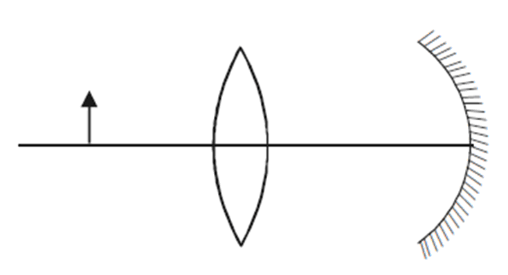 Figure shows a thin converging lens for which the focal length is 5.00 cm. The lens is in front of a concave spherical mirror of radius R = 30 cm. If the lens and mirror are 20.0 cm apart and an object is placed 15 cm to the left of the lens, determine the approximate distance of the final image from lens. (in cm).