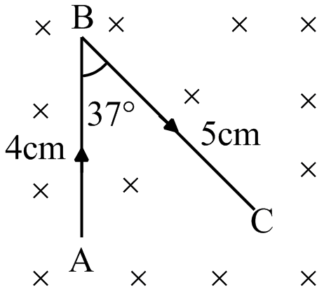 A uniform conducting wire ABC where angle between AB & BC is 370 has a mass of 10 g. The wire AB is parallel to y axis. A current of 2A flows through it. The wire is kept in a uniform magnetic field B = 2T (in wards) the acceleration of wire will be (assume no other force)
