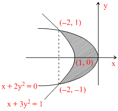 The area of the plane region bounded by the curves x + 2y2 = 0 and x + 3y2 = 1 is equal to