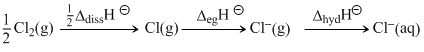 Cl2(g) to Cl-(g)(using the data, ᐃdissHCl2- = 240 k J mol-1, ᐃegHCl- = - 349 k J mol-1 ᐃhydHCl- = - 381 k J mol -1) will be