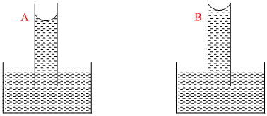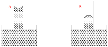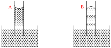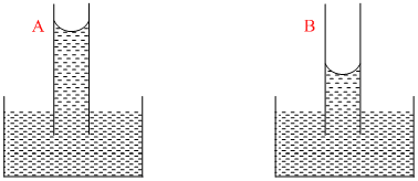A capillary tube (A) is dropped in water. Another identical tube (B) is dipped in a soap water solution. Which of the following shows the relative nature of the liquid columns in the two tubes?
