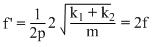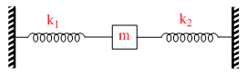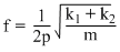 Two springs, of force constants k1 and k2, are connected to a mass m as shown. The frequency of oscillation of the mass is f. If both k1 and k2 are made four times their original values, the frequency of oscillation becomes