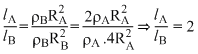 A material ′B′ has twice the specific resistance of ′A′. A circular wire made of ′B′ has twice the diameter of a wire made of ′A′. Then for the two wires to have the same resistance, the ratio lA /lB of their respective lengths must be