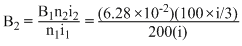 A long solenoid has 200 turns per cm and carries a current i. The magnetic field at its centre is 6.28 × 10-2 Weber/m2. Another long solenoid has 100 turns per cm and it carries a current i/3. The value of the magnetic field at its centre is
