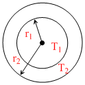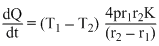 The figure shows a system of two concentric spheres of radii r1 and r2 and kept at temperatures T1 and T2 respectively. The radial rate of flow of heat in a substance between the two concentric sphere is proportional to