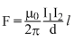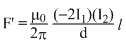 Two long conductors, separated by a distance d carry current I1 and I2 in the same direction. They exert a force F on each other. Now the current in one of them increased to two times and its direction reversed. The distance is also increased to 3d. The new value of the force between them is