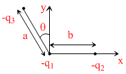 Three charges - q1, + q2 and - q3 are placed as shown in the figure. The x-component of the force on - q1 is proportional to