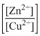 The cell Zn|Zn²⁺(1M)||Cu²⁺(1M)|Cu with $E^\circ_{\text{cell}} = 1.10$ V was allowed to be completely discharged at 298 K. The relative concentration of Zn²⁺ to Cu²⁺, $\frac{[\text{Zn}^{2+}]}{[\text{Cu}^{2+}]}$, is