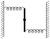 A uniform rod of length L and mass M is pivoted at the centre. Its two ends are attached to two springs of equal spring constants k. The springs are fixed to rigid supports as shown in the figure, and rod is free to oscillate in the horizontal plane. The rod is gently pushed through a small angle θ in one direction and released. The frequency of oscillation is